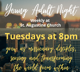 YAG Tuesdays at 8pm in the parish hall The topic is always something different, to empower you to know and live the faith in your everyday life. There are guest speakers, witnesses, small groups, mixers, videos, etc.. depending on the night and theme. It’s an incredible night to grow in your relationship with God and other young adults on the journey!