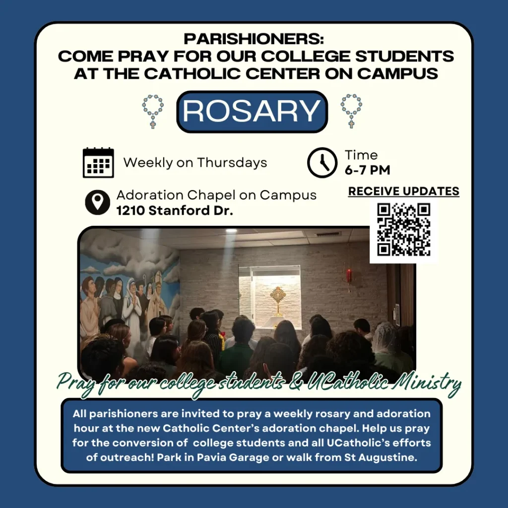 Join us weekly at the new Catholic Center Adoration Chapel on campus to pray for our college students!